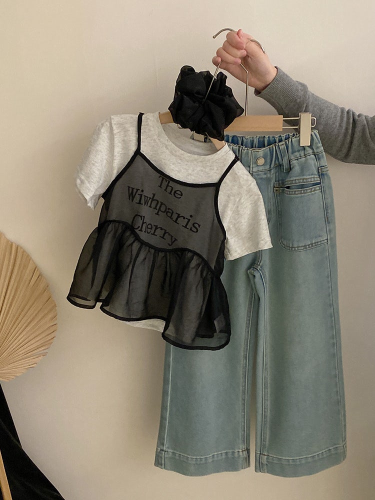 청바지+반팔+시스루나시+머리끈